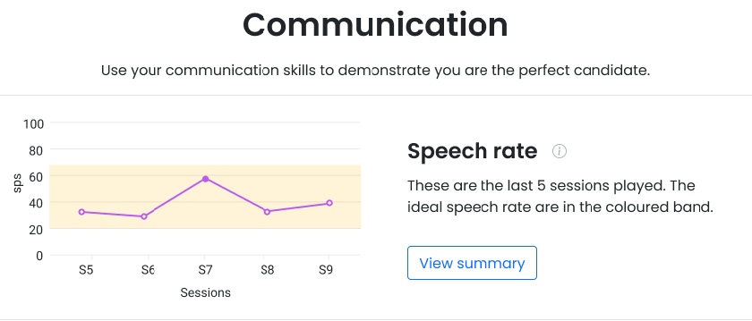 Improve your interview communication skills by analyzing performance indicators for your speech rate. You can easily track your progress for each practice session to check your level of improvement. With each practice session, you will improve and gain confidence in your ability to convince the recruiter that you are the best candidate for the job.